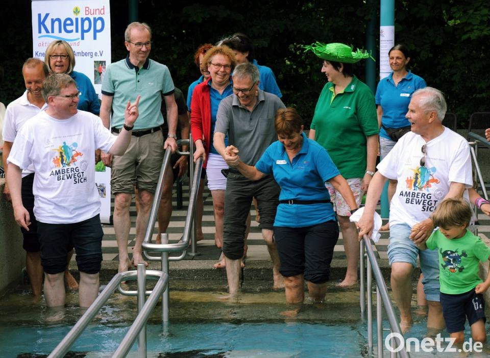 Wer das im Wasser umsetzen will, müsse das im Storchenschritt tun, also immer Knie anziehen, mit dem Bein komplett raus aus dem Becken und wieder eintauchen. Und das so lange, bis sich ein Schmerz anbahnt. Dann gehe es raus aus dem Wasser, aber: "Nicht abtrocknen, nur mit den Händen das Wasser von den Beinen abstreifen und dann trocken laufen." Mit OB Michael Cerny, Bürgermeisterin Brigitte Netta und einigen Offiziellen ging es dann rein ins quellfrische und saukalte Wasser.