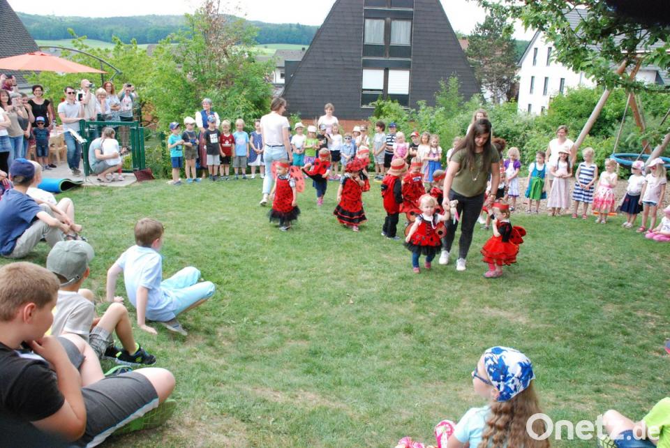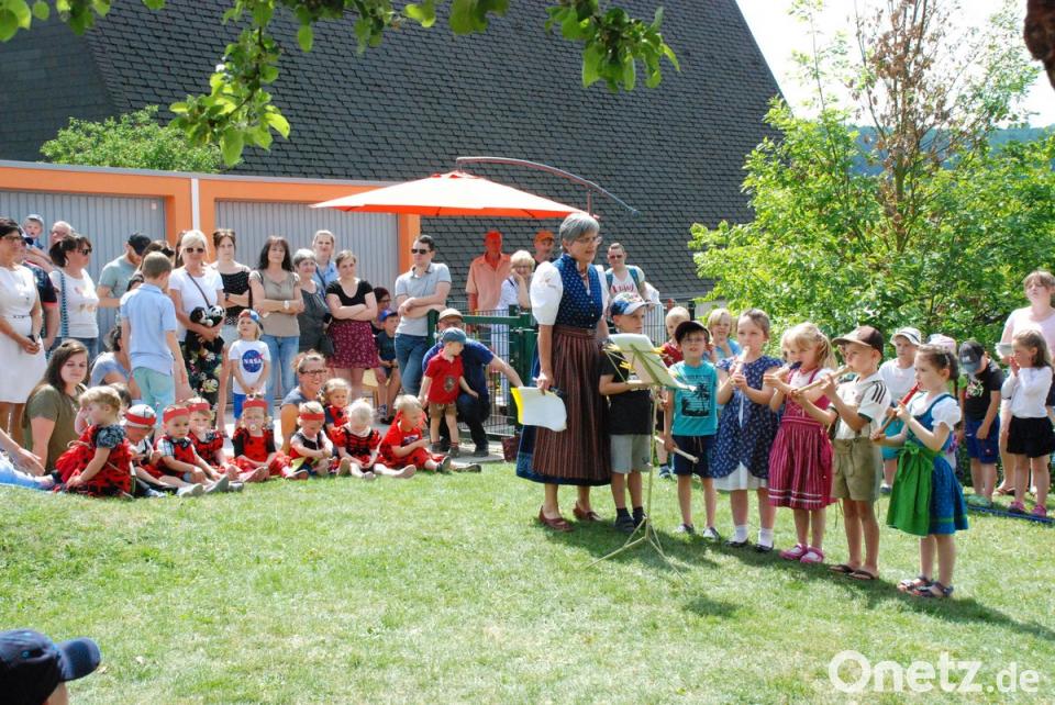 Raigering (sche) Bei hochsommerlichen Wetter eröffneten die Krippenkinder in ihrer rot-schwarzen Kostümen als "Sonnenkäfer" mit einem Tänzchen die Runde. Die jüngsten Kindergartenkinder führten ihren einstudierten Rap auf, den alle rhythmisch begleiteten. Es folgte ein Tanz zu einem Lied aus der Vogelhochzeit. Begeisterung löste bei den Erziehungsberechtigten ein Mutter-/Vatertagslied , gesungen von allen Kindern , begleitet von den "Flötenkurskinder" auf ihren Instrumenten, aus. Im Anschluss war Geschicklichkeit auf einen Parcuor mit 4 errichteten Stationen von Jung und Alt gefordert. Dachziegel, dank einer Spende der Firma Danhauser, konnten gemeinsam als "Familien-Namensschild" bemalt werden. Auf den Partnerweg führten die Kinder ihre Eltern, die die Augen verbunden hatten durch aufgebaute Hindernisse, aber auch umgekehrt die Eltern ihre Kinder. Gemeinsam wurde eine Blumenkarte gebastelt und mit guten Wünschen der Kleinen beschriftet, Weiterhin durften die Eltern ein wohltuendes Handpeeling ihrer Zöglinge verspüren. Inzwischen sorgte der Elternbeirat mit Unterstützung der Eltern für die Versorgung mit selbstgebackenen Kuchen, Bratwürste vom Grill und Getränken.