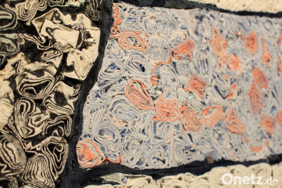 Textilbeton wird erst seit zehn Jahren im Baugewerbe eingesetzt. Ganz neu und weltweit einzigartig ist hingegen die Entwicklung von Textilstein. Der Erfinder kommt aus Burglengenfeld und ist auch deswegen unwiderruflich die Nummer Eins an diesem Abend. Florian Nörl setzt mit seiner Bildenden Kunst neue Maßstäbe. Hoch und gar schwer zu überholen ragt die zu ermessende Skala seines Schaffens. Zurückhaltend und schüchtern wirkt der Künstler selber. Die Haptik des Textilsteins macht die täuschende Optik begreiflich. Frei von Lösungsmitteln, ungiftig und ohne Kunstharze stellt Nörl seinen Stein her. Teil seiner Arbeit ist auch der Rahmen aus Eschenholz, in dem die Gemälde fest verankert liegen. Sein Geheimnis des Entstehungsprozesses hütet der 29-Jährige und das ist auch gut so. Alleinstellungsmerkmale müssen genutzt werden – seine sind vergleichbar mit der Revolution von Bauhaus. Es ist Design für Lampen, Tische oder gar Fliesen. Chapeau, Florian Nörl!