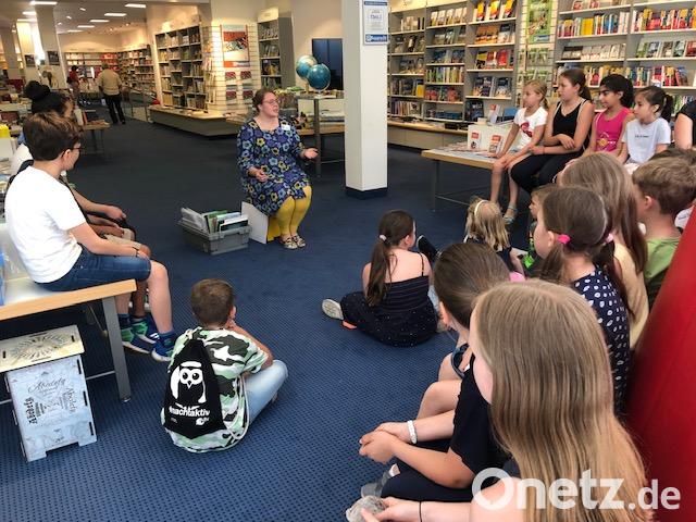 Die Buchhändlerin Frau Lobenhofer empfing uns am Eingang. Sie führte uns nach oben und wir durften uns auf das rote Sofa setzen. Frau Lobenhofer erklärte uns, wie ein Buch entsteht und was das größte und das kleinste Buch der Welt ist. Wir waren ganz erstaunt, als sie uns erzählte, dass das teuerste Buch der Welt 30 Millionen kostet.