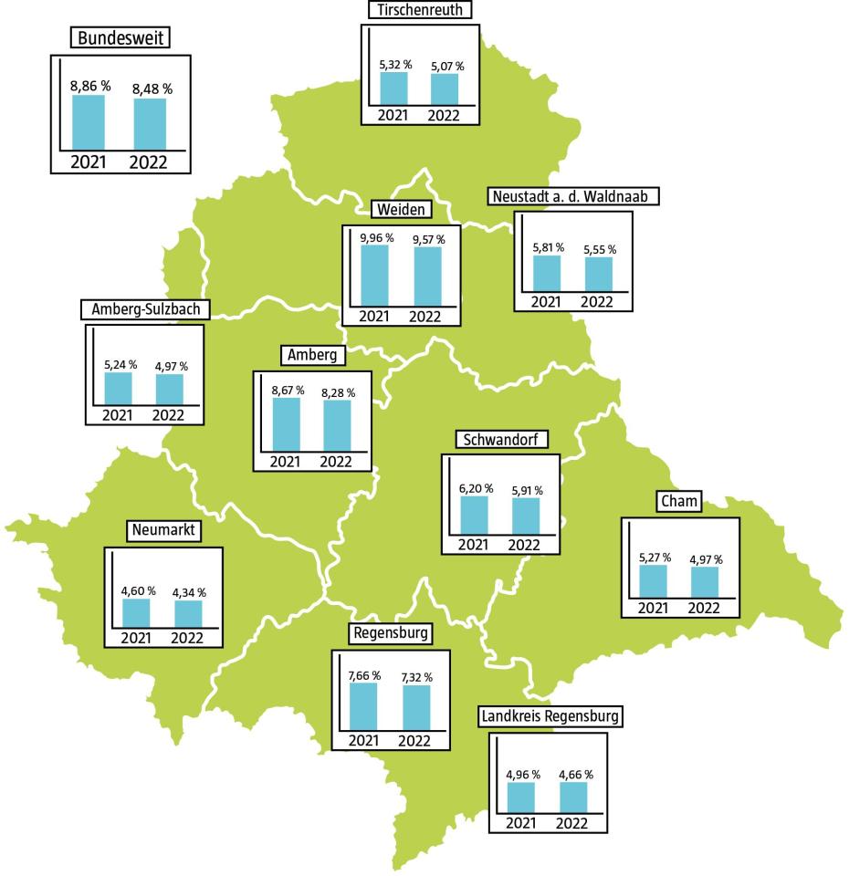Auch in der Oberpfalz ist die Überschuldung von Verbrauchern flächendeckend im Vergleich zum Vorjahr gesunken. In Weiden sank die Überschuldungsquote von 9,96 Prozent auf 9,57 Prozent, in Amberg von 8,67 Prozent auf 8,28 Prozent.