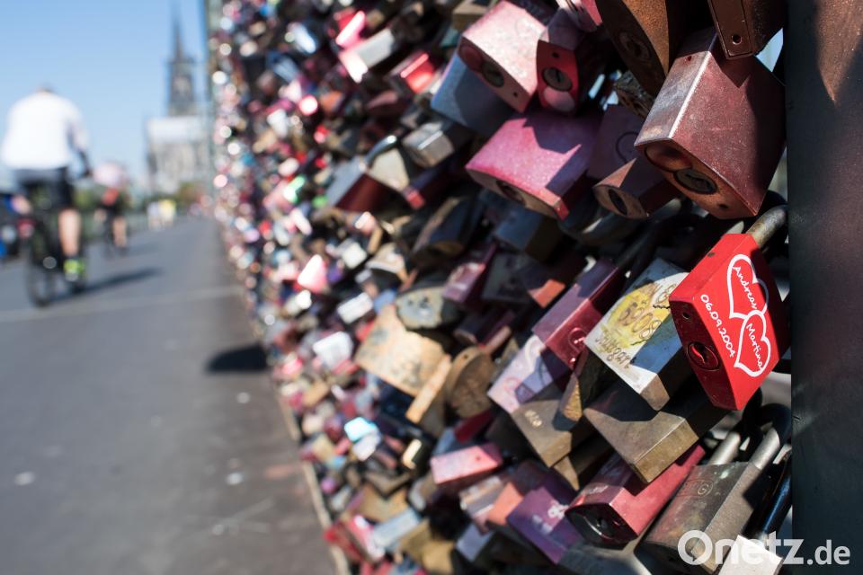 Köln (dpa) - Die Abertausend Liebesschlösser auf der Kölner Hohenzollernbrücke sind eine Touristen-Attraktion - nun sollen alle aus Sicherheitsgründen und zum Korrosionsschutz verschwinden. „Das Gewicht ist nicht das Problem. Aber der Korrosionsschutz des Zauns muss erneuert werden“, sagte ein Sprecher der Bahn in Düsseldorf der „Kölnischen Rundschau“. Damit die Brücke keine Rostschäden bekomme, sei die Maßnahme unumgänglich. Es sei allerdings noch nicht geklärt, was mit den vielen Schlössern geschehen soll.