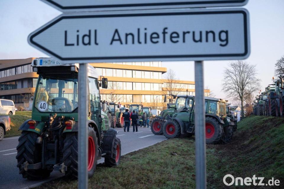 Warnleuchten und blockierte Straßen: Angesichts sinkender Preise vor allem für Milch und Butter haben Landwirte mit Traktoren vor der Lidl-Zentrale in Bad Wimpfen (Baden-Württemberg) gegen die Preispolitik des Discounters protestiert.