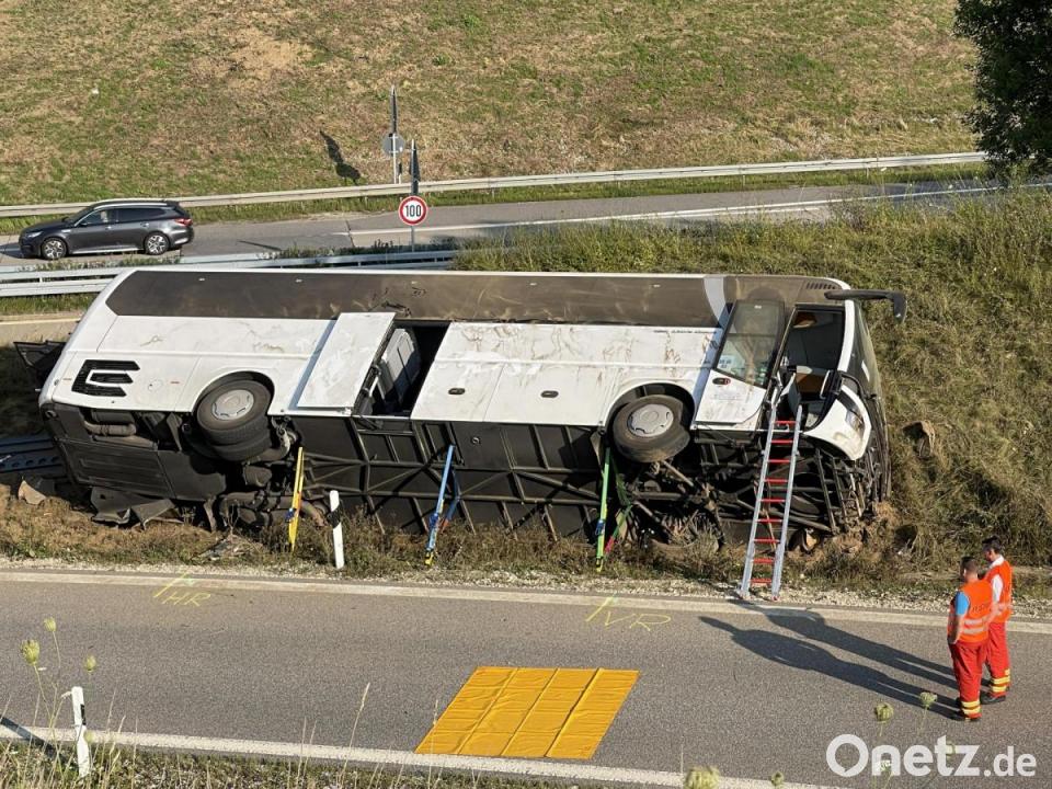Der Bus wurde von einem 57-Jährigen gefahren, der selbst unverletzt blieb. Der Reisebus war am Dreieck Saalhaupt bei der Überfahrt von der Autobahn 93 auf die Bundesstraße 15 ins Schlingern geraten und nach links gekippt, erläuterte ein Polizeisprecher. Nach Angaben der Beamten befanden sich 37 Menschen aus Tschechien in dem Fahrzeug. Der Bus war auf dem Weg von Italien nach Prag.