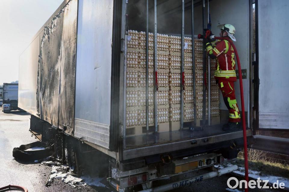 Die Flammen breiteten sich fast auf dem gesamten mit Eierpaletten beladenen Kühlauflieger aus. Gegen Mittag waren die Löscharbeiten laut Polizeisprecher beendet. Die Bergungsarbeiten dauerten noch an. Eine Spur blieb vorerst gesperrt. Die Ursache für den Brand und die Schadenshöhe waren zunächst nicht bekannt.