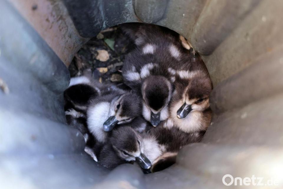 Die Einsatzkräfte konnten die Küken per Hand aus dem Rohr holen und in einem Karton sammeln. Die Gänsemutter beobachte den Rettungseinsatz von einem Turm aus. Nachdem die Feuerwehr die Küken im Schlosspark ausgesetzt hatte, flog die Mutter herbei und watschelte mit ihrem unversehrten Nachwuchs davon.