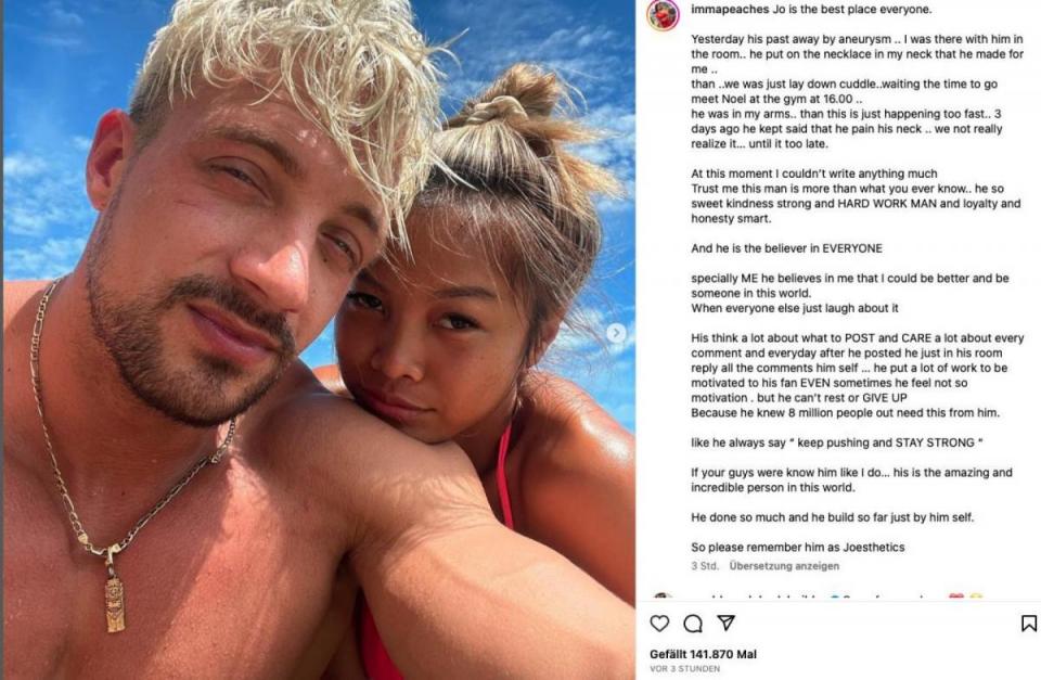 Fitness-Influencer "Joesthetics" ist tot. Der 30-jährige Johannes Lindner ist an am Freitag, 30. Juni, einem Aneurysma, einer Weitung eines Blutgefäßes, gestorben. Das teilte seine Freundin Nicha auf Instagram mit. Der Sportler sein nun an einem "besseren Ort", heißt es in dem Post.