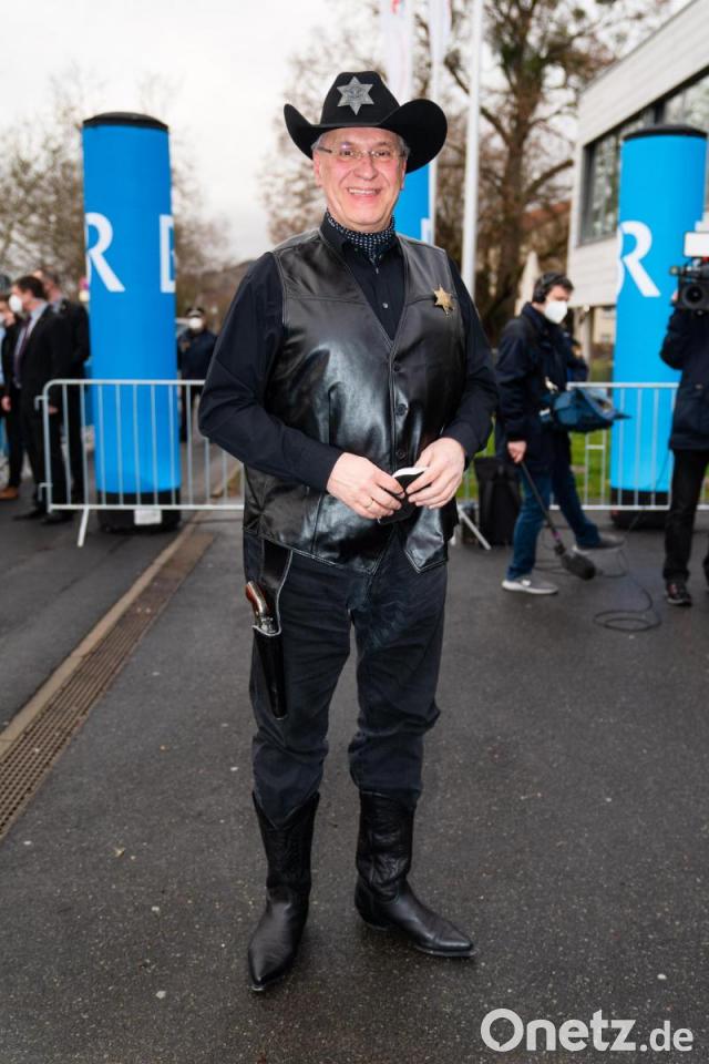 Der bayerische Innenminister Joachim Herrmann (CSU) kommt als Sheriff zur Aufzeichnung der Sendung „Fastnacht in Franken 2022“.