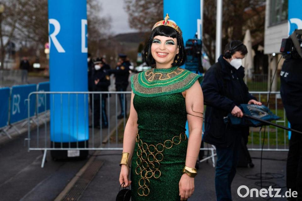 Katharina Schulze kommt als Cleopatra zur Aufzeichnung der Sendung „Fastnacht in Franken 2022“.