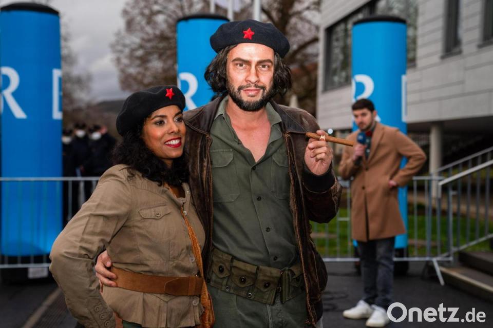 Der Fraktionsvorsitzende der FDP im bayerischen Landtag, Martin Hagen, kommt als Che Guevara mit Ehefrau Anisha zur Aufzeichnung der Sendung „Fastnacht in Franken 2022“.