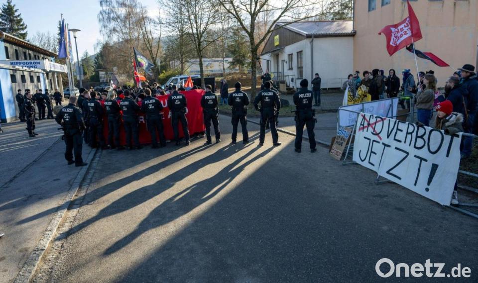 Vor der Veranstaltungshalle in einem Gredinger Gewerbegebiet demonstrierten in der Spitze rund 250 Menschen. Unter anderem die Grüne Jugend, die Linksjugend und die DGB-Jugend hatten dazu aufgerufen.