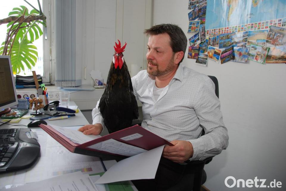 Gelegentlich bringt Jürgen Drosten, LKA-Sachbearbeiter in der Personalabteilung, seinen Gockel Maxl mit. Der Hahn ist blind und kann deswegen nicht lange alleine bleiben. In seltenen Fällen, wenn die Betreuung zu Hause nicht gesichert ist, darf Maxl mit ins LKA, berichtet das Social Media-Team des LKA auf der Facebook-Seite. Dann darf er auch schon mal auf den Schoß von Jürgen Drosten - und unterstützt auch mal bei der Sachbearbeitung. Maxl sei wirklich ein Vorzeigehahn und deshalb störe er im Büro auch nicht. "Im Gegenteil, die Kollegen sind begeistert von ihm und freuen sich über seinen Besuch."