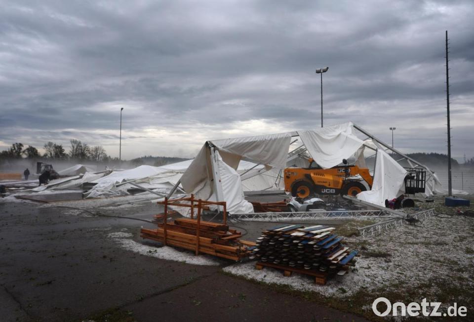 Ein zerstörtes Festzelt, ein abgedecktes Seniorenzentrum, eine durch Hagelkörner zerstörte Fassade und viele Verletzte: Unwetter haben am Wochenende im Süden Bayerns für Verwüstung gesorgt. Zwölf Menschen wurden am Samstag in Kissing bei Augsburg beim Aufbau eines Bierzeltes verletzt. Sechs von ihnen schwer, wie die Polizei mitteilte. Das Zelt sei von einer Windböe erfasst worden. Rund 30 Menschen hätten versucht, es festzuhalten.