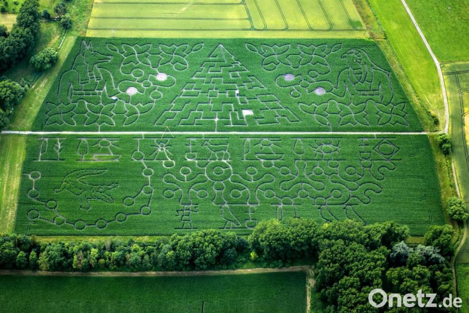 Verschlungene Wege und Irrwege führen durch ein Maisfeld in Niederbayern. Fünf sorgfältig ausgetüftelte Labyrinthe fügen sich zu einem riesigen Mais-Irrgarten zusammen - laut dem Deutschen Rekord-Institut in Hamburg ist es mit gut 16.600 Quadratmetern der größte weltweit. Inhaber Markus Hiendlmeier und der Landrat von Straubing-Bogen, Josef Laumer (CSU), freuen sich auf viele Besucher im Mais-Irrgarten. Die fünf Motive sollen Unterhaltung und kniffelige Aufgaben in verschiedenen Schwierigkeitsgraden bieten.