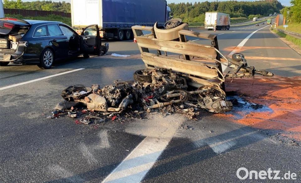 Bei einem missglückten Überholmanöver auf der Autobahn 9 bei Betzenstein (Landkreis Bayreuth) sind zwei Motorräder komplett verbrannt und eine Limousine geschrottet worden. Verletzte gab es keine, wie die Polizei mitteilte.