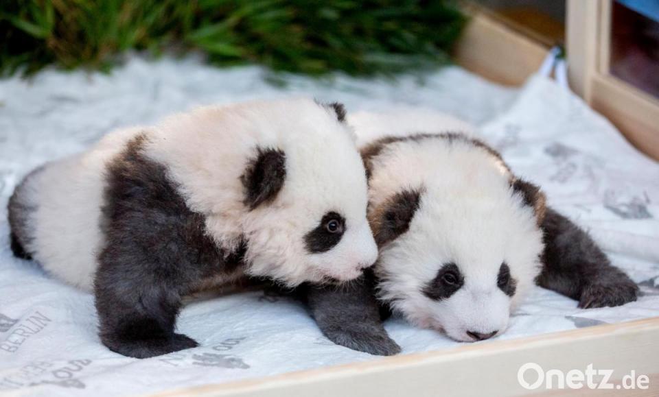 Langsam wird das Bettchen, auf das alle warten, herangerollt. Zwei kleine schwarz-weiße Bärchen liegen darin auf dem Bauch, alle Viere von sich gestreckt. Verschlafen sehen sie aus bei ihrem ersten Auftritt vor der Presse, die Panda-Zwillinge im Berliner Zoo.
