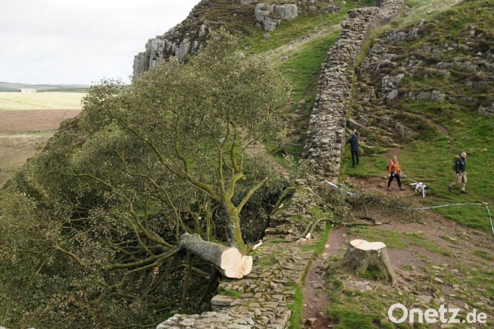 Auf Bildern war zu sehen, dass der mächtige Baum mit einem sauberen Schnitt kurz über dem Boden abgetrennt worden war. Der Baum stand in einer Senke - der sogenannten Sycamore Gap - und war ein beliebtes Fotomotiv. Nun lag der Stamm über den Hadrianswall gestreckt. Die Mauer war von den Römern im zweiten Jahrhundert nach Christus gebaut worden, zum Schutz vor Angriffen aus dem Norden sowie zur Kontrolle von Handelswegen. Überreste ziehen sich durch die hügelige Landschaft nahe der englisch-schottischen Grenze und gelten als beliebtes Wanderziel.