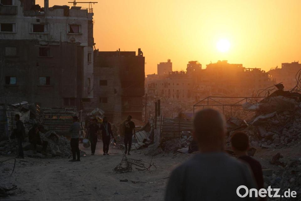 Palästinenser gehen in Gaza-Stadt an Häusern vorbei, die durch die israelische Luft- und Bodenoffensive zerstört wurden.