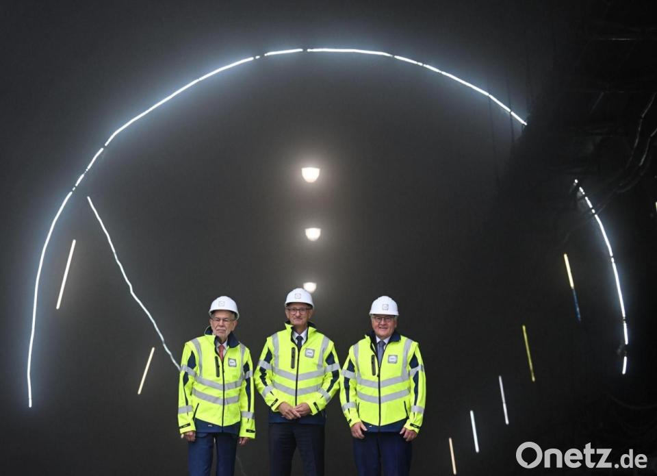Österreichs Bundespräsident Alexander van der Bellen (l-r), Tirols Landeshauptmann Anton Mattle und Bundespräsident Frank-Walter Steinmeier besichtigten die Baustelle des Brenner-Basistunnels.
