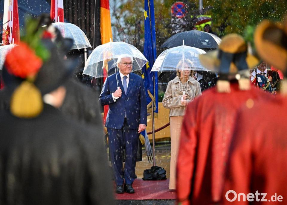 Bundespräsident Frank-Walter Steinmeier und seine Ehefrau Elke Büdenbender nehmen im strömenden Regen am landesüblichen Empfang durch die Tiroler Schützenkompanie teil.