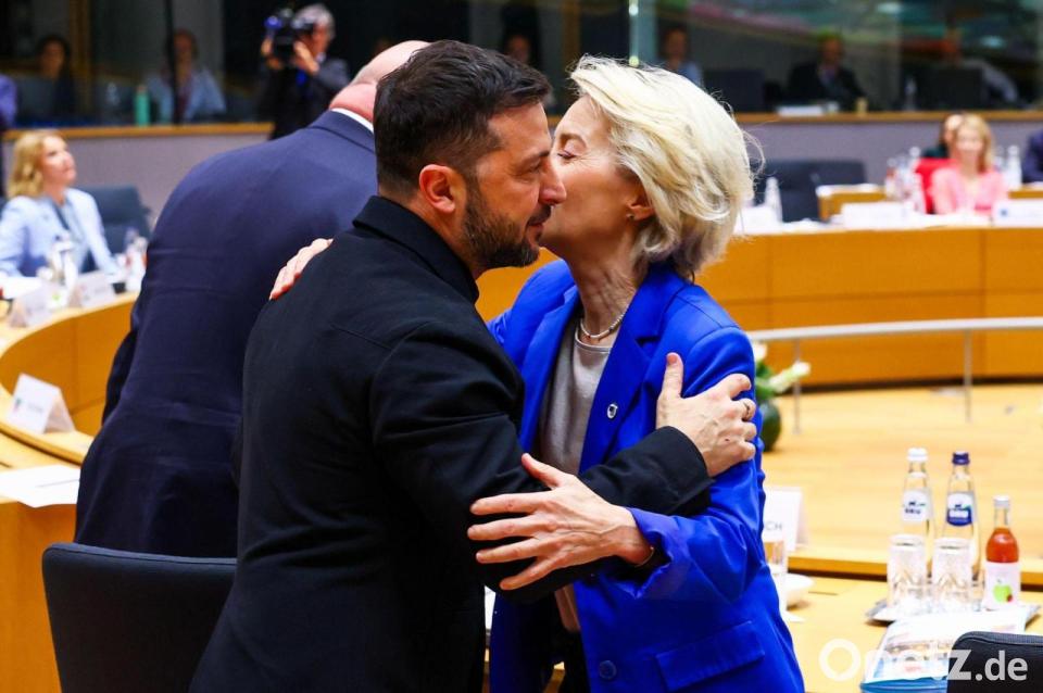 Herzliche Begrüßung von Ursula von der Leyen, Präsidentin der Europäischen Kommission, für den ukrainischen Präsidenten Wolodymyr Selenskyj bei einem Treffen am runden Tisch auf dem EU-Gipfel.