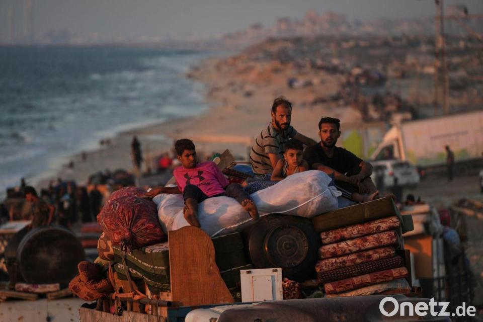 Vertriebene Palästinenser fliehen aus Gaza und tragen ihre Habseligkeiten entlang der Küstenstraße in Richtung des südlichen Gazastreifens.