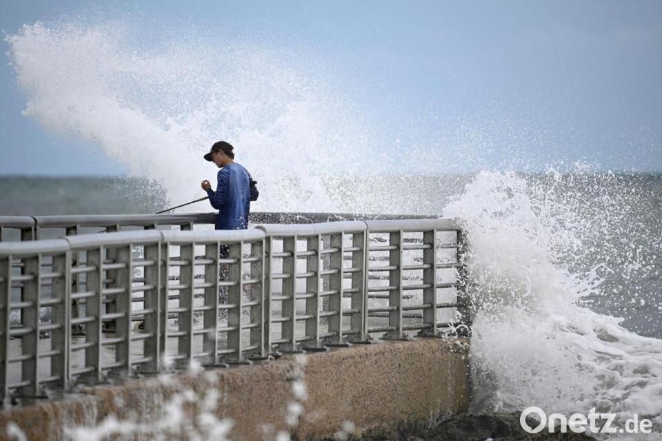 Nathan Goff wird beim Angeln auf dem Steg im Sebastian Inlet State Park von einer Welle durchnässt, als der Tropensturm Imelda in Melbourne Beach, Florida, an der Küste vorbeizieht.