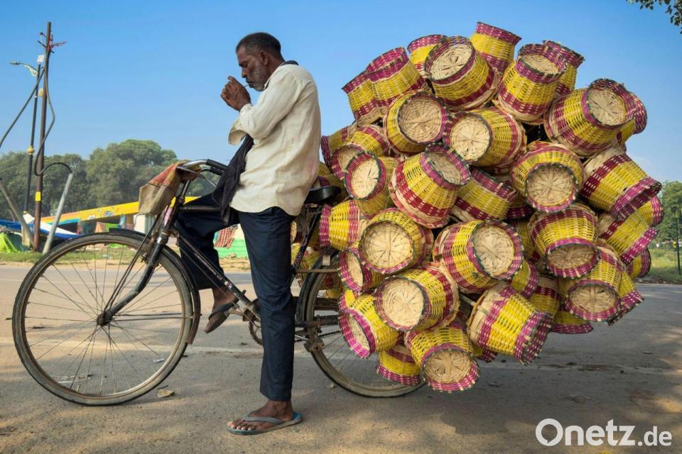 Ein Verkäufer verkauft bunte Bambuskörbe am Straßenrand im nordindischen Bundesstaat Uttar Pradesh.