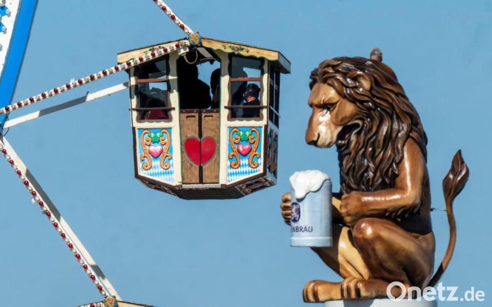 Wiesn-Besucher fahren in einem Riesenrad auf dem 190. Münchner Oktoberfest an der Kulisse einen überdimensionalen Löwen mit Bierkrugs vorbei.