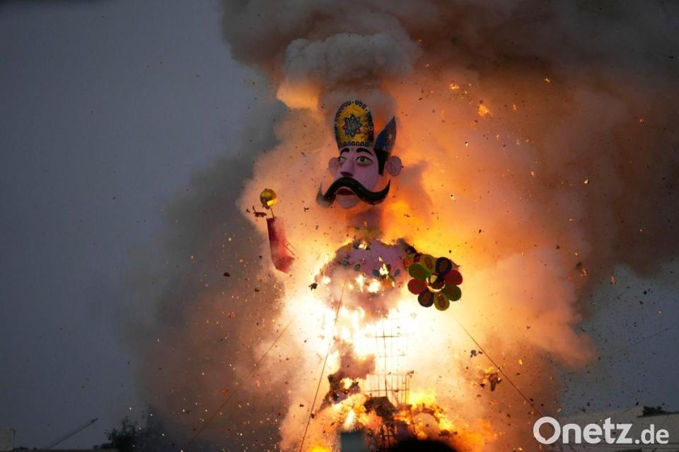 Ein Bildnis von Kumbhakarna, dem Bruder des Dämonenkönigs Ravana, geht in Flammen auf, um das Ende des Dussehra-Festes in Jammu in Indien zu markieren.