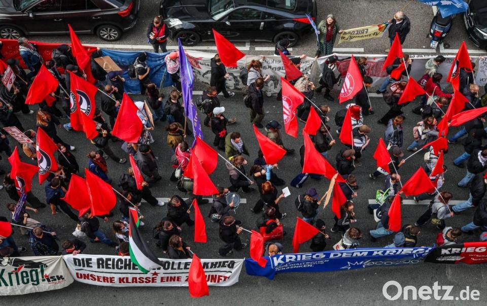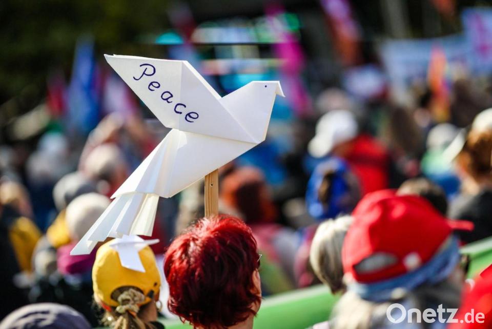 Zahlreiche Menschen nehmen an einer Demonstration von Friedensinitiativen teil und ziehen durch die Stuttgarter Innenstadt.