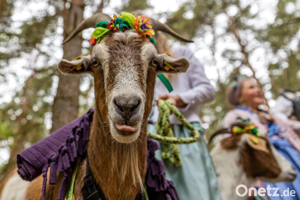 Eine Ziege steht bei der Vorbereitung auf den 25. Niederlausitzer Almabtrieb und streckt die Zunge heraus.