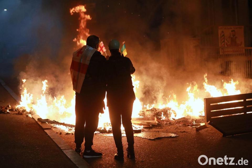 Demonstranten mit einer georgischen und einer ukrainischen Nationalflagge stehen im Stadtzentrum von Tiflis hinter einer brennenden Barrikade während einer Kundgebung der Opposition, bei der sie die Kommunalwahlen boykottieren und die Freilassung politischer Gegner fordern.