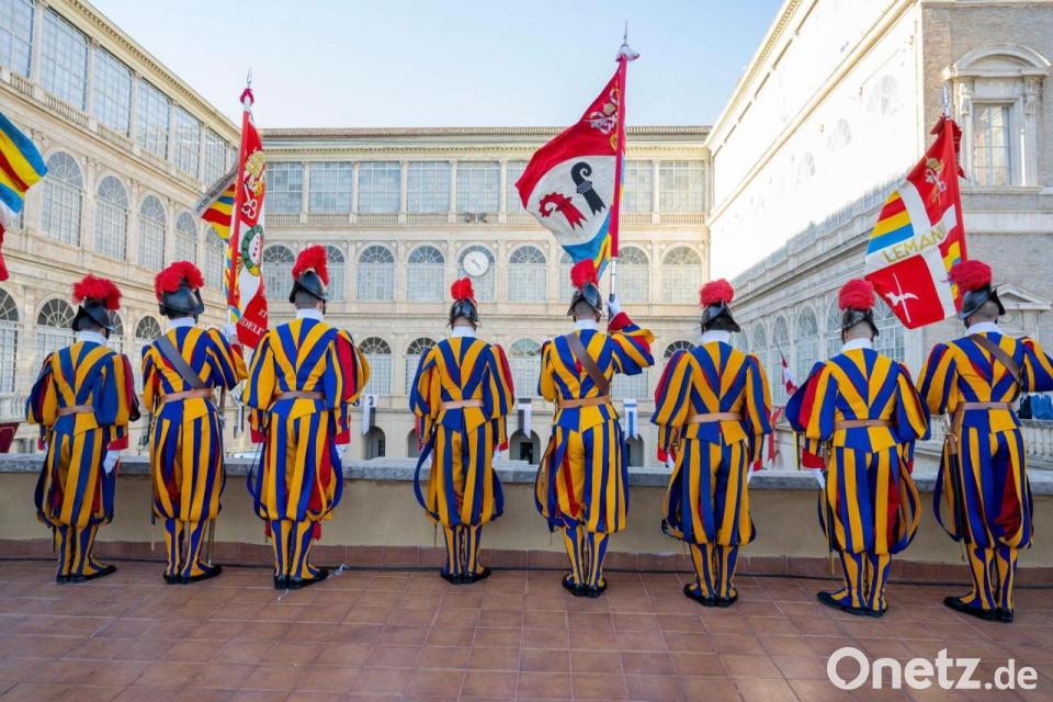 Schweizergardisten überwachen den Hof während der Vereidigungszeremonie der Schweizergarde im Damasus-Hof des Apostolischen Palastes im Vatikan.