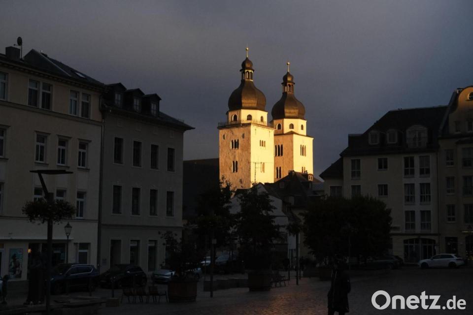 Die Türme der Johanniskirche in Plauen werden von der untergehenden Sonne beschienen.