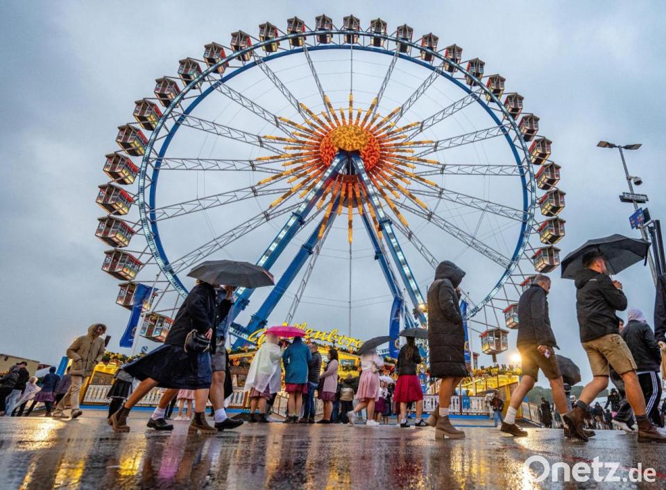 Besucher des Oktoberfestes in München gehen im Regen über das Festgelände vor dem Riesenrad.