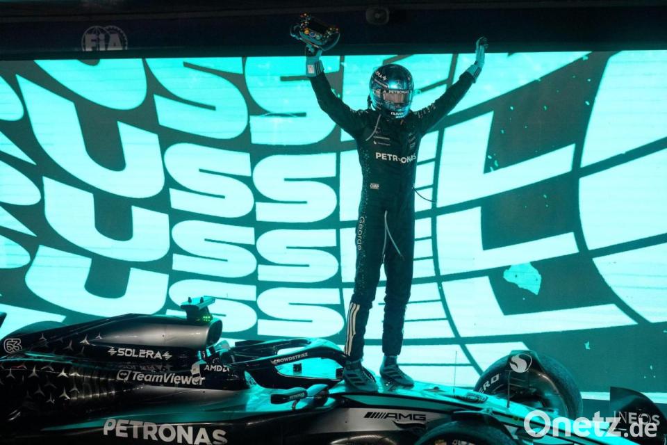 Motorsport: Formel-1-Weltmeisterschaft, Grand Prix von Singapur, Rennen. Der britische Mercedes-Pilot George Russell jubelt über seinen Sieg.