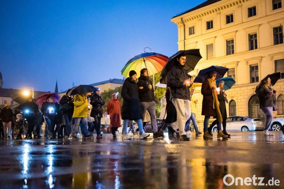 Teilnehmer des Schweigemarschs "Mach Dich auf für Menschlichkeit!" gehen mit Kerzen auf der Ludwigsstraße in München.