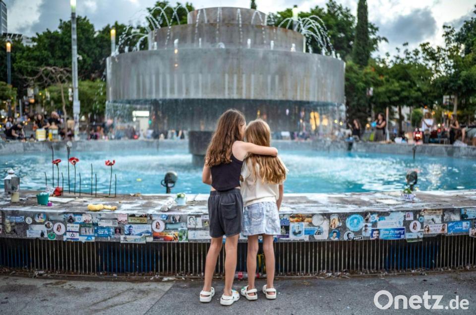 Zwei Mädchen stehen an der Gedenkstätte am Dizengoff-Brunnen in Tel Aviv im Vorfeld des zweiten Jahrestages des Hamas-Anschlags vom 7. Oktober 2023.