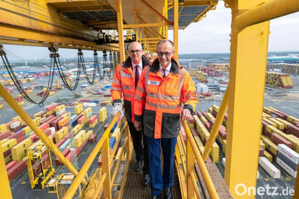 Hoffentlich schwindelfrei: Bundeskanzler Friedrich Merz und Bremens Bürgermeister Andreas Bovenschulte (SPD) stehen auf einer Containerbrücke im Überseehafen in Bremerhaven.
