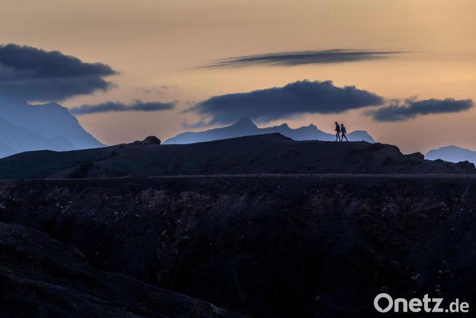 Panodrama: Menschen gehen auf der Insel Fuerteventura unter dramatisch wirkenden Wolkenformationen.