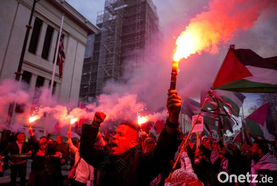 Propalästinensische Demonstranten gehen vor dem Fußball-WM-Qualifikationsspiel zwischen Norwegen und Israel in Oslo auf die Straße.