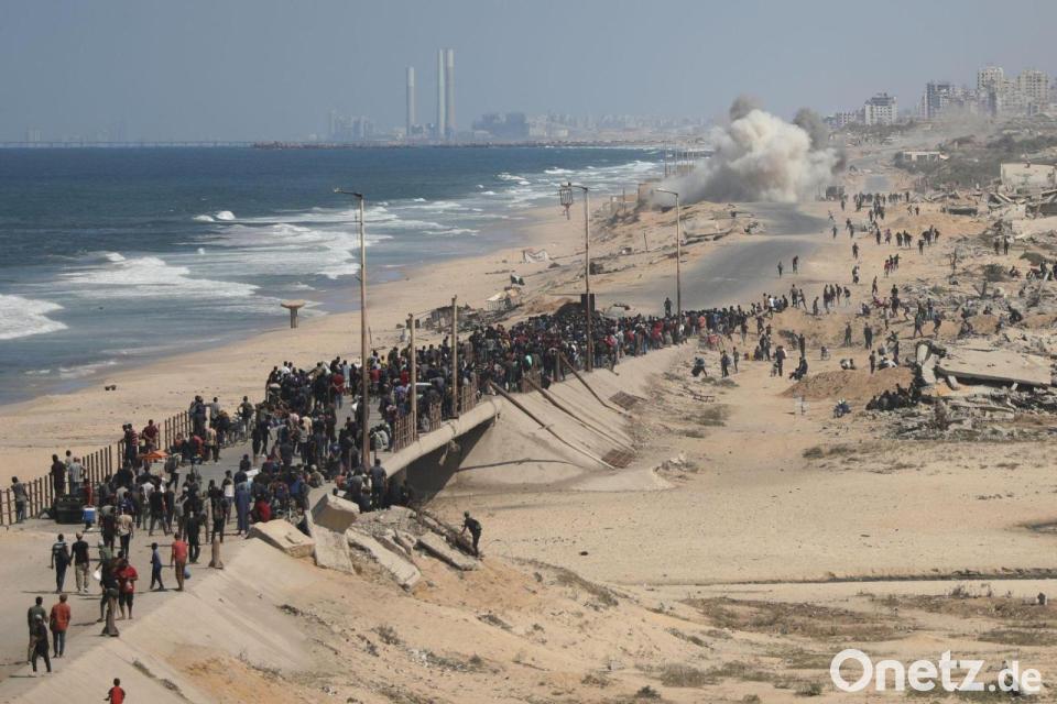 Palästinenser gehen entlang der Küstenstraße in der Nähe von Wadi Gaza im zentralen Gazastreifen in Richtung des nördlichen Gazastreifens.