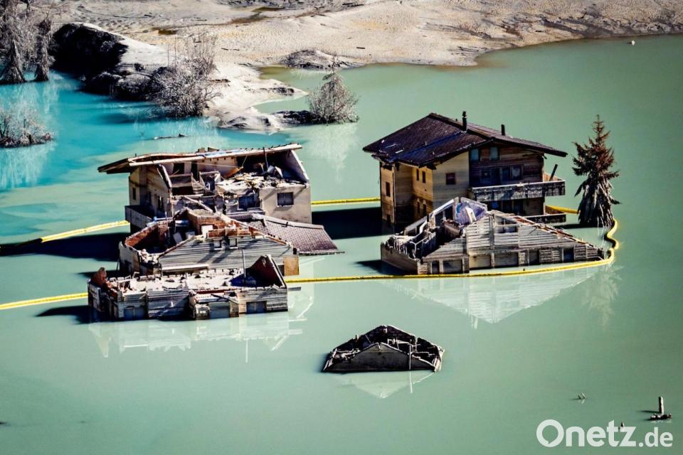 Ein Blick auf die Häuser im Blattensee vom Weiler Weissenried im Lötschental aus. La Fondation Blatten organisierte in Blatten im Wallis eine wichtige Reinigungsaktion. Mehr als 70 Freiwillige waren damit beschäftigt, Staub, Schlamm und andere Abfälle von den Häusern des Weilers Weissenried zu entfernen, der gerade noch von dem Erdrutsch am 28. Mai 2025 verschont geblieben war.