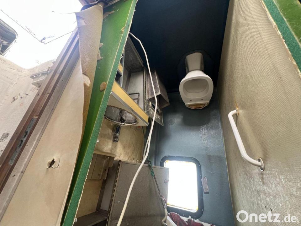 Die Toilette steht Kopf im Aufbau des ehemaligen Lotsenboots, das vor Sylt angespült worden ist.