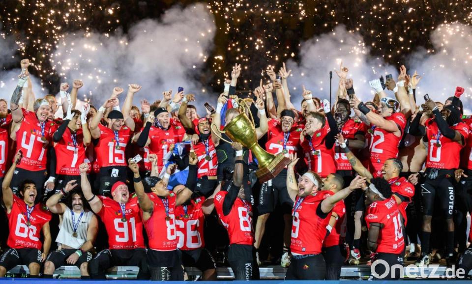 Die Potsdam Royals werden in Dresden Deutscher Meister im American Football und jubeln mit dem Pokal.