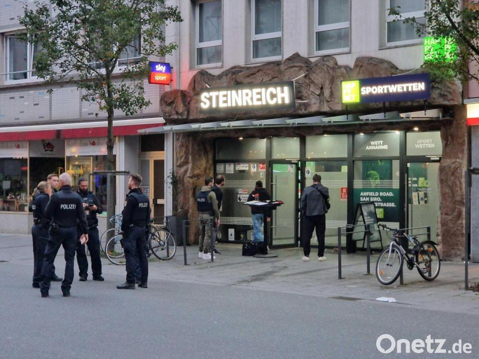 Polizeibeamte stehen auf dem Marktplatz. Ein Unbekannter hat auf dem Marktplatz von Gießen mehrere Schüsse abgegeben.