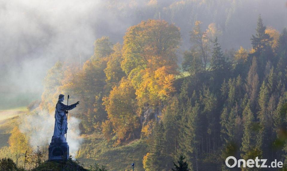 Die Statue des "Guten Hirten" in Hütten bei Schelklingen steht in der Herbstlandschaft.
