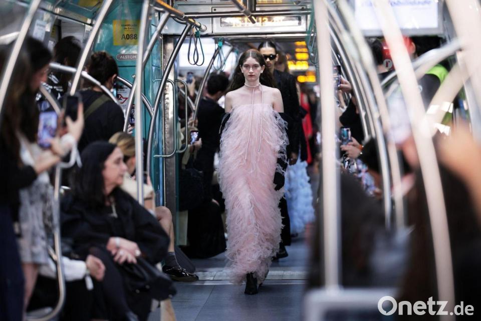 Models tragen Kreationen von Gloria Coelho während einer Veranstaltung der Sao Paulo Fashion Week in der U-Bahn.