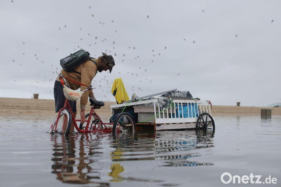 Ein Mann passt seine Ladung auf dem Fahrradanhänger an, um den durch heftigen Regenfällen überfluteten Weg entlang zufahren.